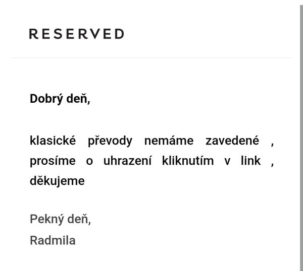 Volala som do banky,kde mi povedali,že Reserved veľmi nešťastné ten mail formuloval, chyba bola na ich strane,lebo ja som platbu autorizovala, no Reserved si peniaze nestiahol, a ja som ešte aj predtým,ako mi objednávka prišla volala na infolinku,že všetko prebehlo v poriadku a odošlú mi to.