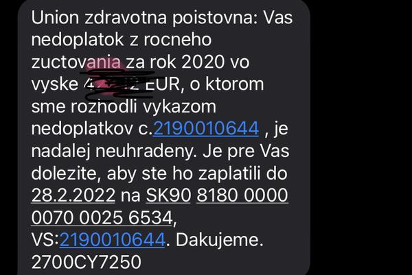 @kukypink988 na toto si daj bacha...ja som davno pred rokma mala v zp dlh len 41€, po nejakej dobe mi prisla sms z neznameho cisla podpisana neznamou firmou tiez ze zaplatit do urciteho terminu sumu ale este ktomu +10€ takze zaplatit 51€...ale prisiel mi aj list zo zp ze je tam ten dlh...tedy som sla priamo na pobocku a tam uhradila tych 41€ lebo su vselijake firmy a spekulanti co si ani nevedno ako uctuju ....takze radsej chod cim skor do zp a dohodni si platkovy kalendar nez aby sa mali toho chytit nejaky vymahaci