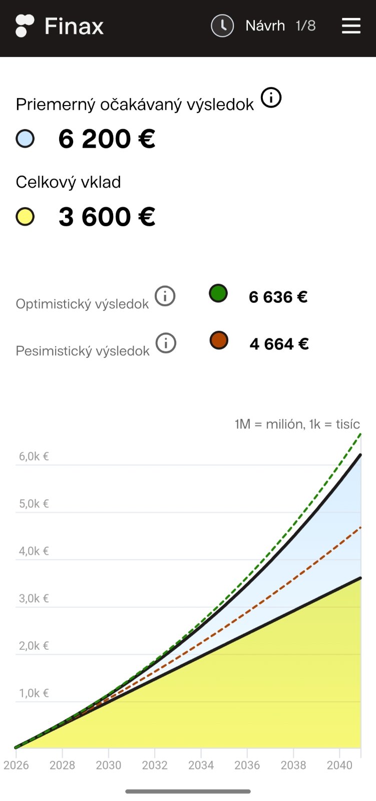 Názorný príklad, vyklikala som na finax kalkulačke výnos po 15 rokoch pravidelného investovania 20€ mesačne. Vidíš ten rozdiel medzi investovaním a obyčajným sporením/ponožkou. Je super, že chceš dať dcére niečo na začiatok do života, len treba myslieť aj na infláciu, lebo teraz máš pocit, že bude super, ak jej dáš v 18tich 3000€, ale keď k tomu príde, tak tá suma už bude v tej dobe vlastne nič... Áno, investovanie sa spája s rizikom, ale myslím, že stojí za to, aj keď len tých 20€ mesačne 😊