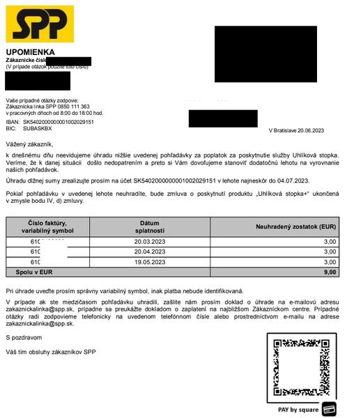 Skontrolujte si, pod akým variabilným symbolom uhrádzate Vaše platby do SPP. Ak ako variabilný symbol používate napr. Vaše zákaznícke číslo, tak sa Vám nikdy nepodarí zrušiť zmluvu k Uhlíkovej stopke. Princíp je v tom, že platby uhrádzané pod zákazníckym číslom sú v SPP "ukladané na jednu kopu" ktorej názvom je meno odberateľa a z tej kopy sa uhrádzajú úplne všetky zmluvné záväzky, ktoré má odberateľ voči SPP (zmluva o združenej dodávke plynu, zmluva o Uhlíkovej stopke, zmluva o združenej dodávke elektriny, ...). Znamená to, že ak na tejto kope budú nejaké peniaze, tak z tejto kopy bude SPP donekonečna čerpať peniaze aj na úhradu Uhlíkovej stopky.
