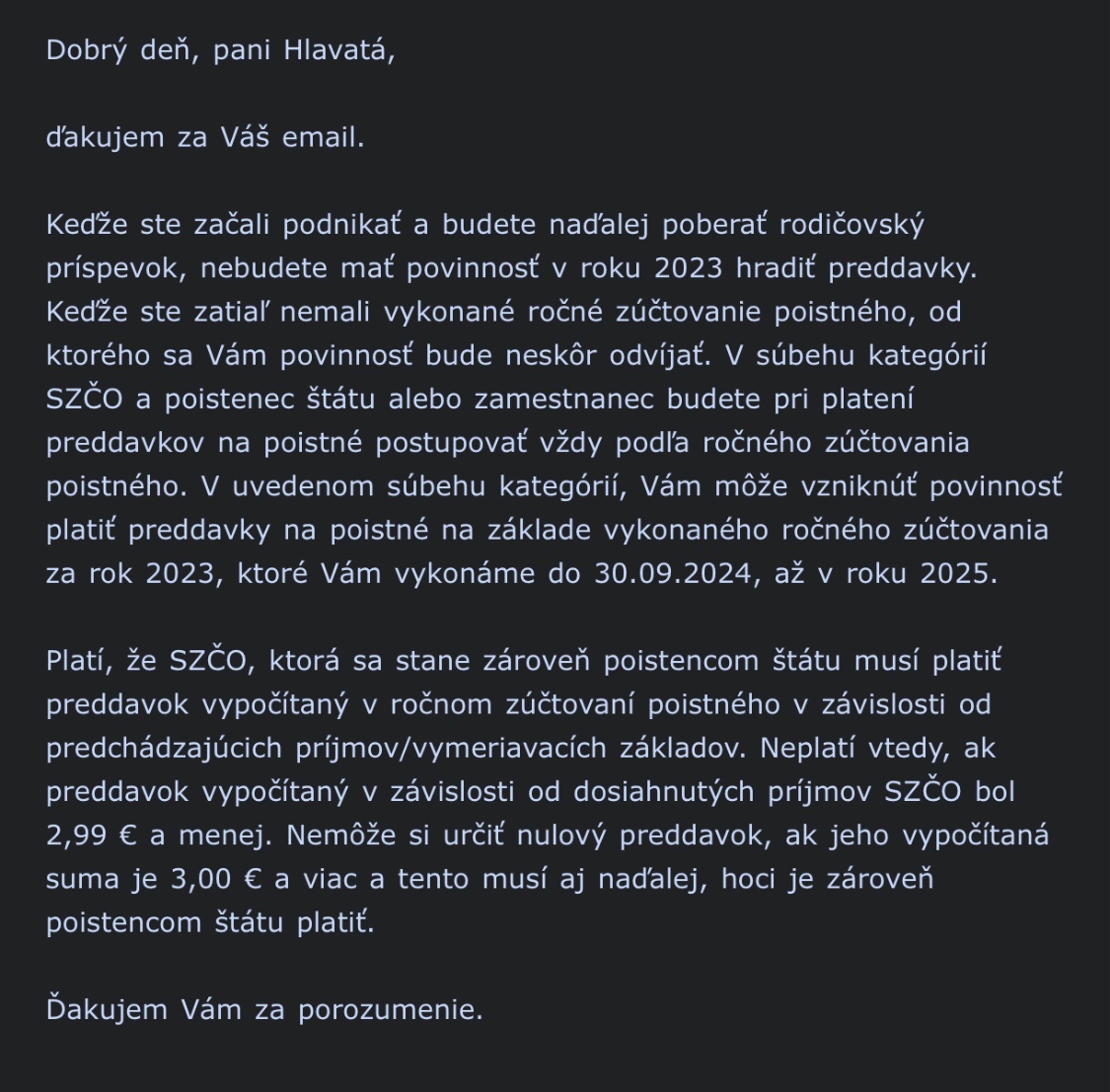 Ahojte , toto mi odpísala pani ohľadom poistenia počas živnosti na RD. Nerozumiem tomu, mám teda platiť každý mesiac niečo alebo nie ? Ďakujem za odpoved.