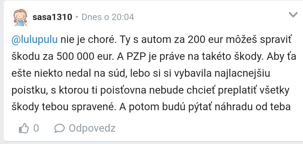 @enigmaenie no však toto, že niekdy je lepšie sa poriadne pozrieť na podmienky a nie na cenu. A o tom tu stále píšem dokola. Stačí, že nabúra s 200 eurovým autom do nejakého 300 000 eur auta, poškodený si požičia náhradné vozidlo v rovnakej cenovej kategórii a bude mať čo robiť. Nič viac som tým nechcela poukázať. Preto radšej mám PZP v takých poisťovniach, ktoré s tým problém nemajú. A preto možno aj tých 50 eur mohla oželieť. Možno sa jej 3x vrátia. Dúfajme, že nie