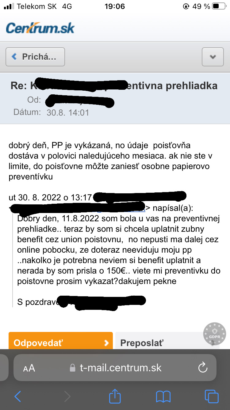Ahojte, ako postupovat prosim ked mi neschvalili prispevok, z dovodu, ze nemam absolvovanu PP. Pritom to nieje pravda, kedze som bola 11.8.2022 ..aj som doktorke 30.8.2022 pisala mail . Ta mi odpisala, ze pp vykazana bola, len nabieha az dalsi mesiac.. tak som caka a dnes mi prisiel takyto mail, mam z toho hlavu smutku , lebo som pravdepodobne prisla o 150€.. da sa to nejako riesit? u zubara som bola 16.8.2020.. dakujem