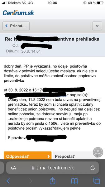 Ahojte, ako postupovat prosim ked mi neschvalili prispevok, z dovodu, ze nemam absolvovanu PP. Pritom to nieje pravda, kedze som bola 11.8.2022 ..aj som doktorke 30.8.2022 pisala mail . Ta mi odpisala, ze pp vykazana bola, len nabieha az dalsi mesiac.. tak som caka a dnes mi prisiel takyto mail, mam z toho hlavu smutku , lebo som pravdepodobne prisla o 150€.. da sa to nejako riesit? u zubara som bola 16.8.2020.. dakujem