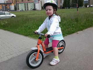 uz nie odrazadlo, ale bicykel bez pedalov First Bike, plastovy, lahucky, 2,8 kg. Nie je tazky na nosenie ak ho to uz nebavi. Teraz zaciname s bicyklom. Este ma kolobezku.