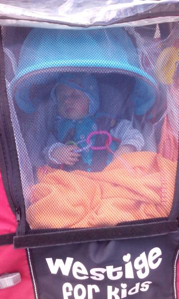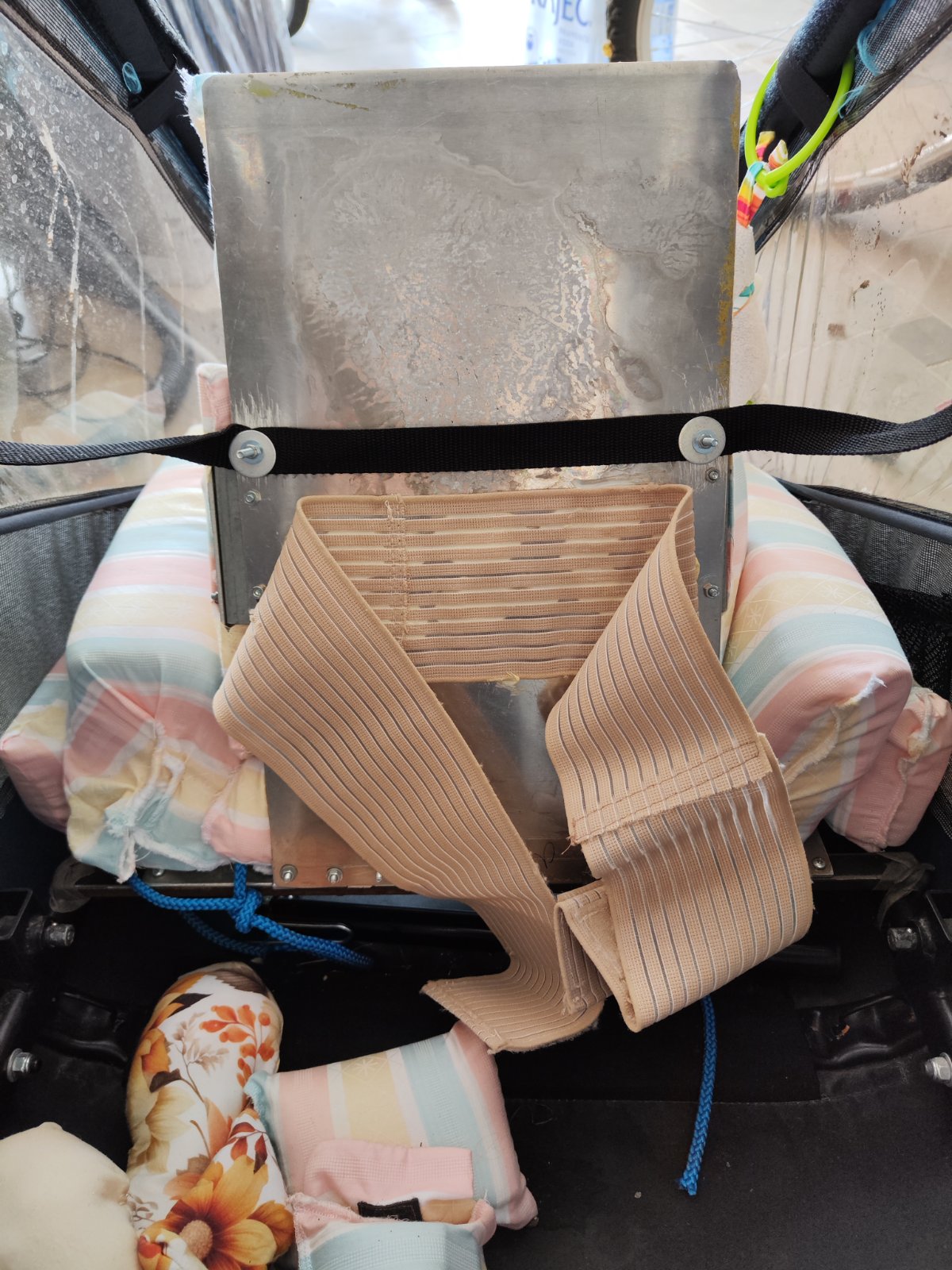 Zadna stena cyklovozika bola plachta natiahnuta na kovovej konstrukcii. Plachtu som zlozila a repsnurami som priviazala cyklosedacku (neskor sportovu cast kociara) o konstrukciu cyklovozika tak, aby drzala i po bokoch a zaroven v predozadnom smere.