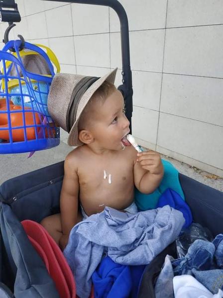 Má extra široké kolesá, a okrem tej tahacej tyče má aj madlo takže ho môžeš tlačiť aj ako kočík...jediné mínus že nemá striešku ale ani nebola treba, dali sme klobúk a v zálohe bol slnečník taký ten čo sa dáva na kočíky. Boli sme s ním v Chorvátsku a musím povedať že je to mega vec, využívali sme každý deň. Všetok bagel sme si naložili a odviezli aj dieťa. Určite neváhaj!