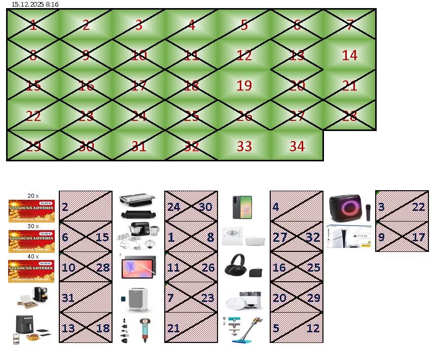 ahojte v okienku číslo 2 je 20 vianočných žrebov v okienku 26 je tablet a v okienku 32 je robotický čistič okien viac neviem