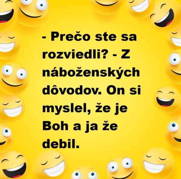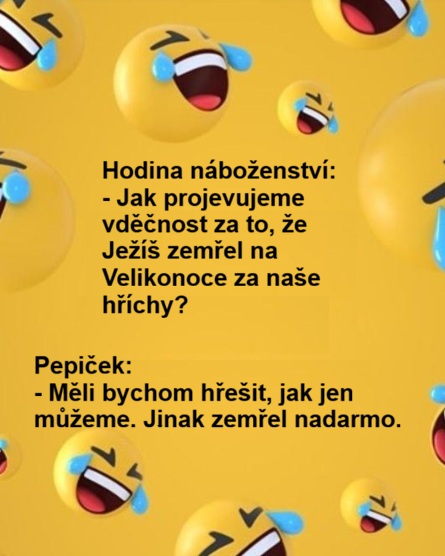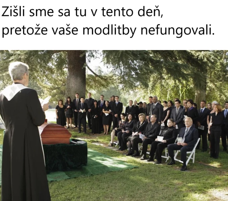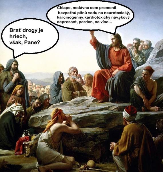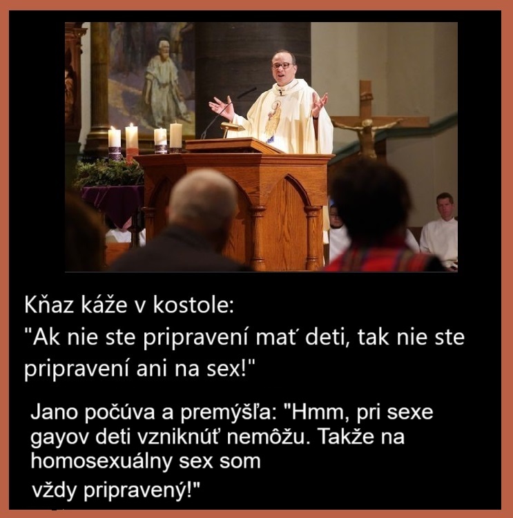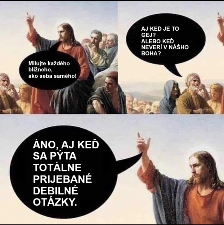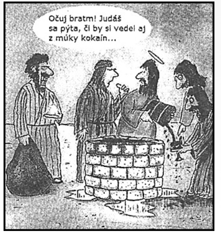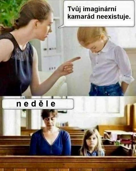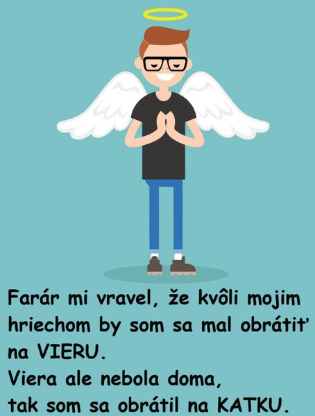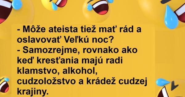 Dvaja ateisti na kostole opravujú strechu, keď tu sa pod nimi zjaví pobožná babka, kľakne si a modlí sa. Dohodnú sa, že si z nej zrobia srandu a tak jeden polohlasne šepká "Tu je Ježiš, tu je Ježiš". Babka kukne hore a hovorí: "Ty buc cicho, kedz še s tvoju matku rozpravam"