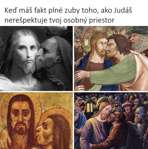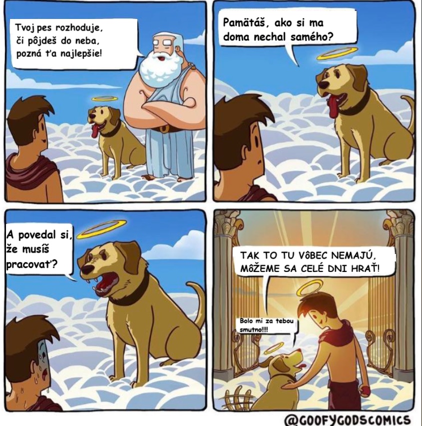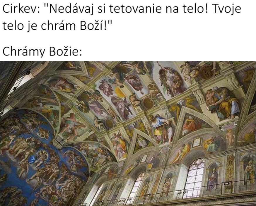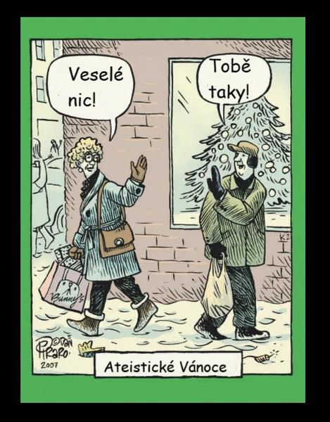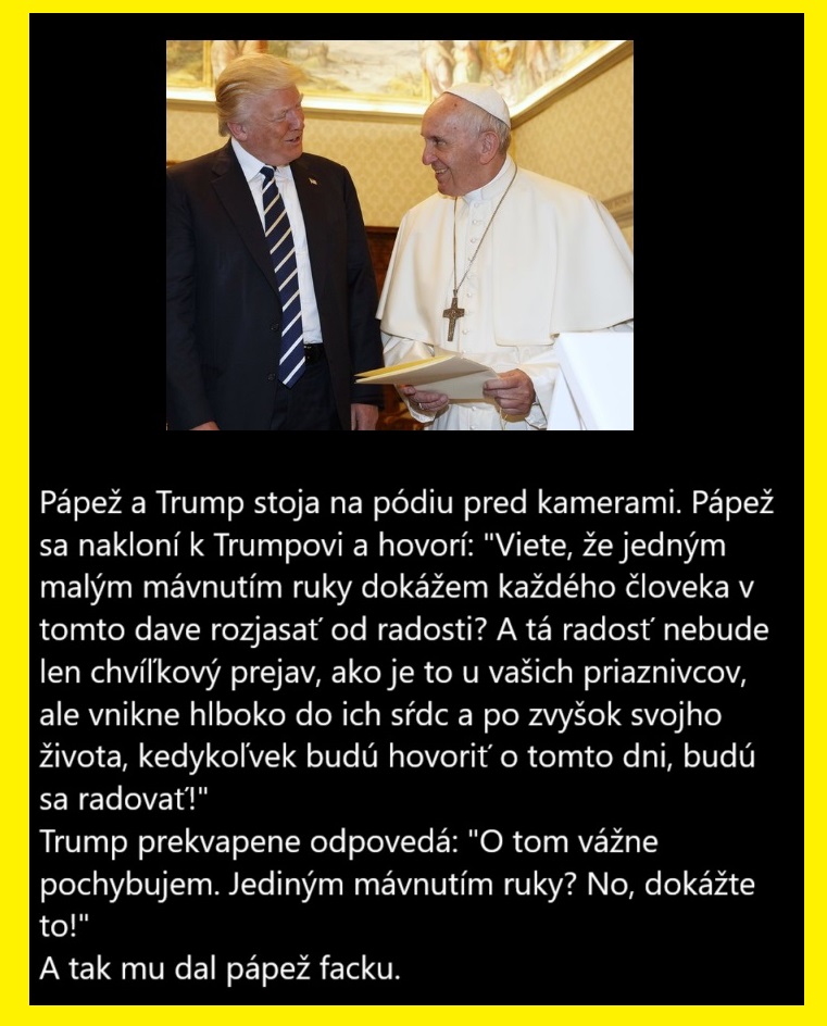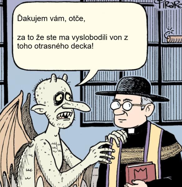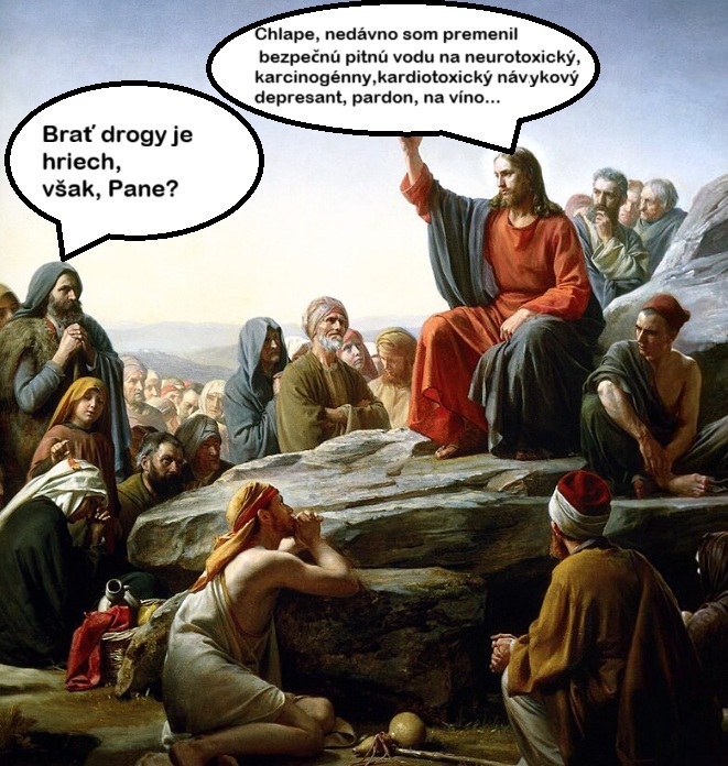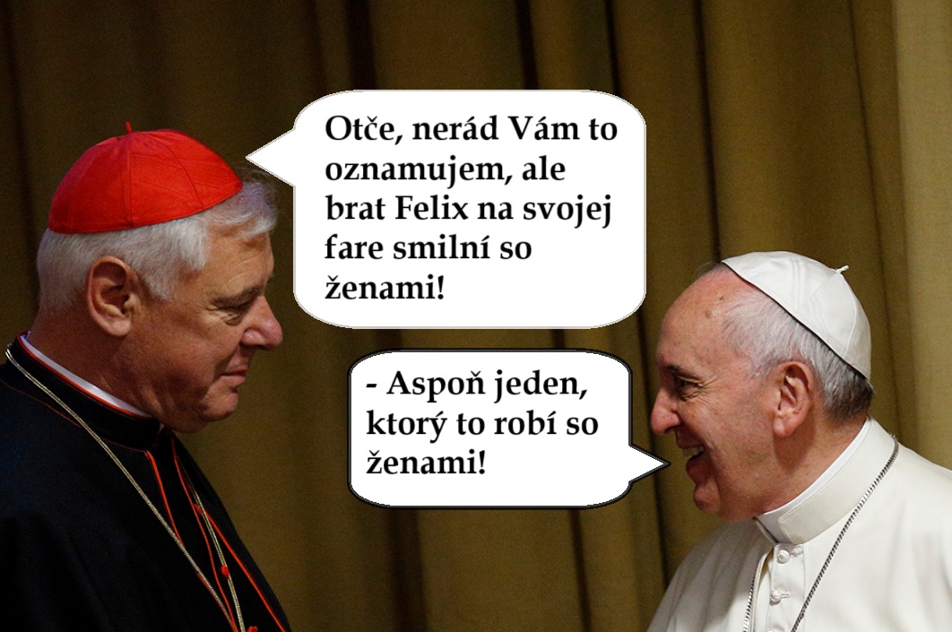 Dvaja ateisti na kostole opravujú strechu, keď tu sa pod nimi zjaví pobožná babka, kľakne si a modlí sa. Dohodnú sa, že si z nej zrobia srandu a tak jeden polohlasne šepká "Tu je Ježiš, tu je Ježiš". Babka kukne hore a hovorí: "Ty buc cicho, kedz še s tvoju matku rozpravam"