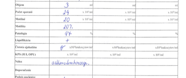@sandra811 na konzultaciu by nam takyto zakladny ako mas nestacil. bud si dajte urobit ten pristrojovy,nas stal 30 EUR alebo Vám v CAR navrhnu ze si urobia svoj. my sme si priniesli a mne na konzultacii rovno urobili sono a potom sme s Dr prebrali co a ako a do týždna som mala doma papiere pre poistovnu. @nafka0483 nam tiez tuto vraveli o IUI a v Brne povedali ze pri nasich problemoch by bolo IUI zbytocne,isli sme rovno do IVF. ja mam PCO a muz teratozoospermiu (len morfo nizsia),asteno je este aj mensi pocet,sa mi zda,co vobec nemusi byt tak.