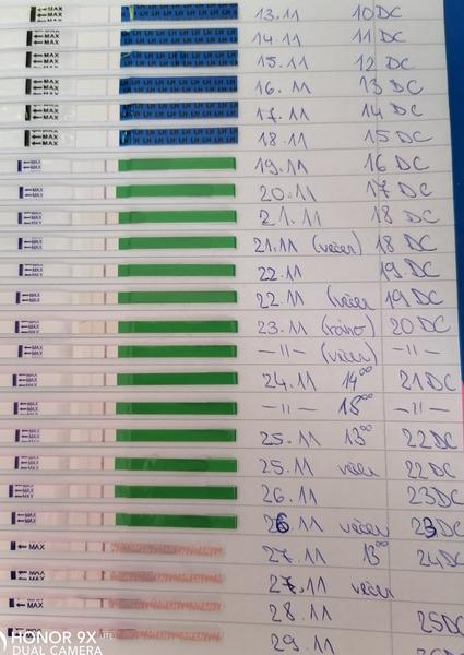 Ahojte, myslite ze 27.11 mohol byt pozitivny ovulacny test? Alebo ani jeden 🙈 Mam 35 dnovy cyklus... Teplotu nemeriam ale podla hlienu by mi to sedelo na 27ho 🤷♀️ dnesny už bol bleducky zasa..