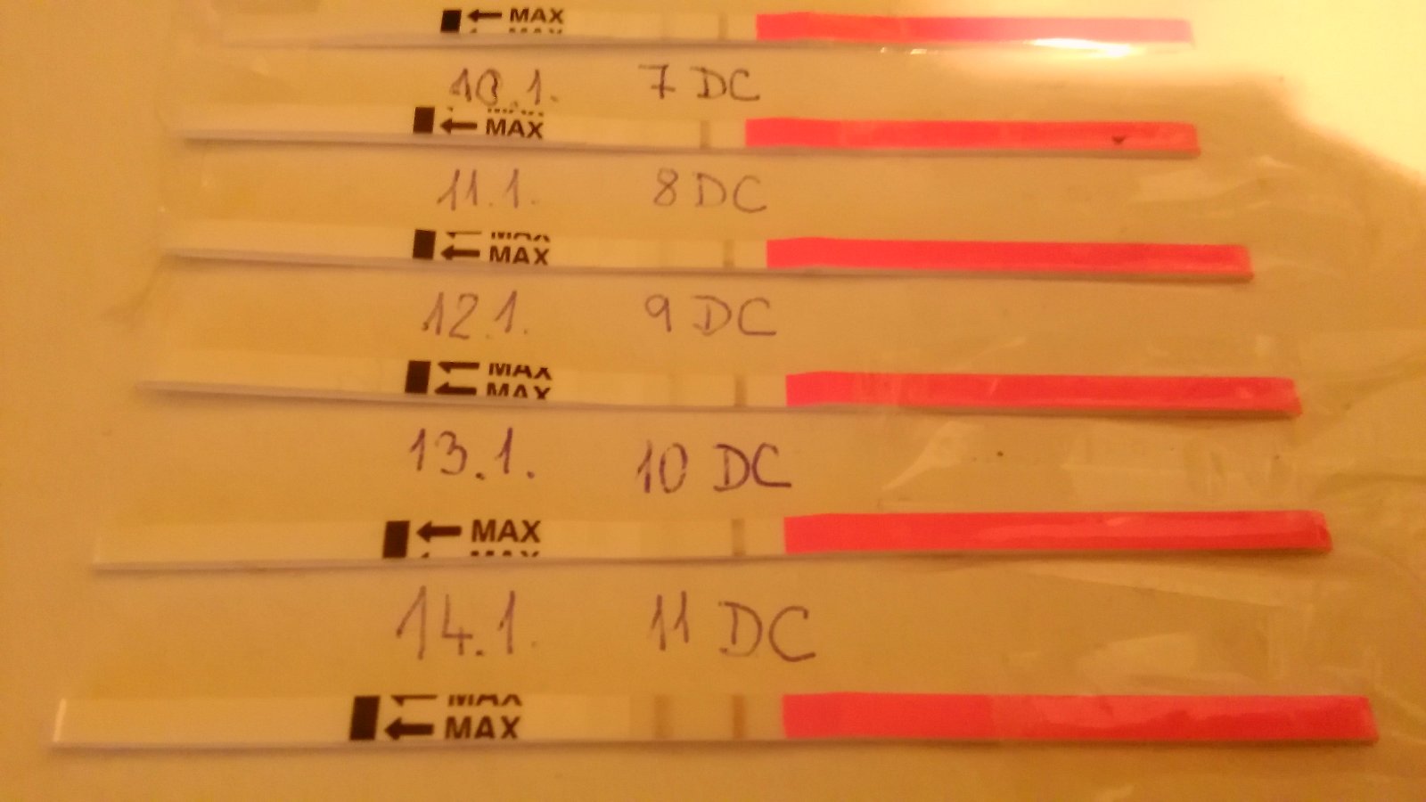 @michhaela moja iba raz...vcera som skusila aj vecer,ale ziadna zmena...mozno dnes...kedze robim si od 10dc. Vcera tam uz bola viditelna ciarka ale nie silnejsia...tak dufam,ze dnes uz bude.a ty ako si na tom???ktody dc si??
