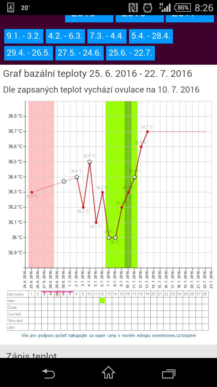 @kchan V tom prvom grafe si si zaznačovala teplotu a tam naspodku máš rátane dni cyklu od dňa 1, kdežto pri druhom grafe nemáš rátané dni cyklu, ale kalendárne dni, asi preto ťa to mýli... ovulku si teda mala podľa mojích vápočtov 14ty deň cyklu, čo je 8.7. podľa kalendára..