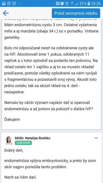 Dakujem za Vase reakcie. V pondelok idem na konzultaciu koli operacii. Takze coskoro bude vonku a dufam, ze sa dockam vytuzeneho tehotenstva.
