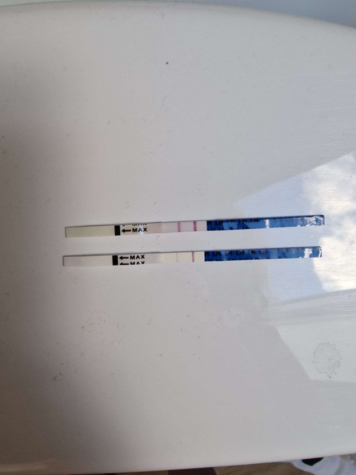 Ahojte, ja dnes 17dc, vcera nasadeny duphaston, a dnes (vrchny test) ma celkom prekvapil 😀nie je uplne pozit, ale ked som ich porovnavala v marci s drmax tak ked bol dr max pozit tento bol cca takyto 😀 mna by ani nenapadlo robit test ale nejak hlien sa objavil necakane 😀 standardne mam 60 dnove cykly