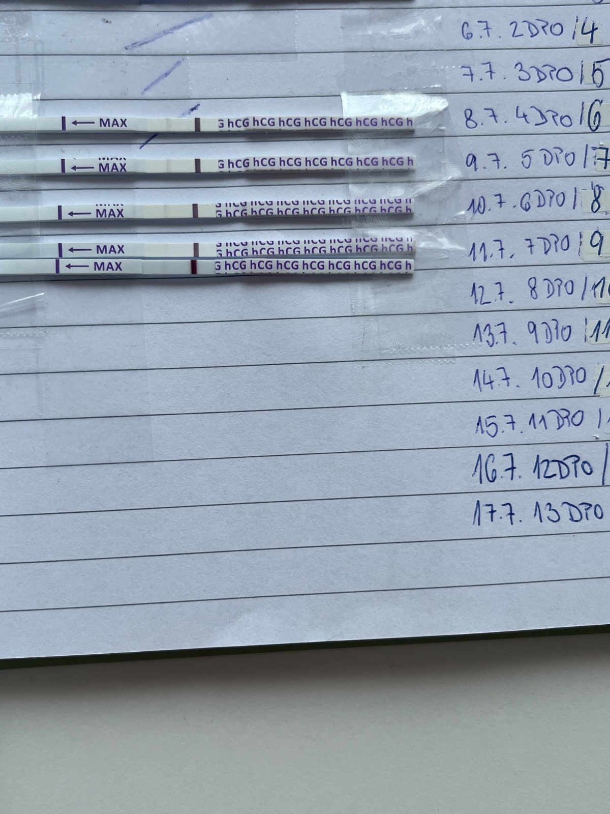 Ahojte, tak odber hcg dnes takto ❤️ 4.7. - 1778 a dnes 11.7. - 12600. Vyzerá že to krásne stúpa 🙏