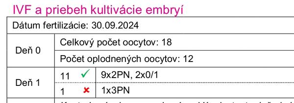 @andyka105 Odobratých vajíčok bolo 18, z toho zrelých 12... Do tých 12 napichali spermie. Z toho 9 sa oplodnilo tabuľkovo, 2 neoplodnili, ale ešte im dávajú šancu a 1 sa oplodnilo nesprávne.