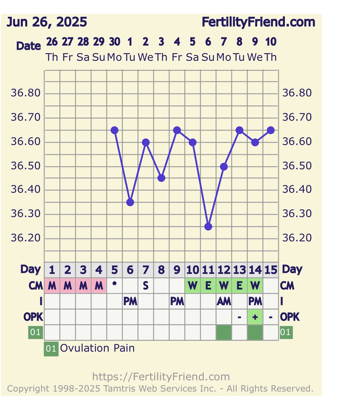 @marinadelrey dnes mam takyto graf, len vcera vecer som mala pozitivny test. Dufam, ze sa mi zajtra/pozajtra potvrdi ovu aj teplotou. Ale tak uvidime, minuly mesiac mi prvy krat cyklus nejako chaosil, tak snad sa mi hormony neburia. Sama som zvedava ako to bude tento mesiac. 2 roky som nemerala bt, tak neviem porovnat z predchadzujucimi mesiacmi zatial.