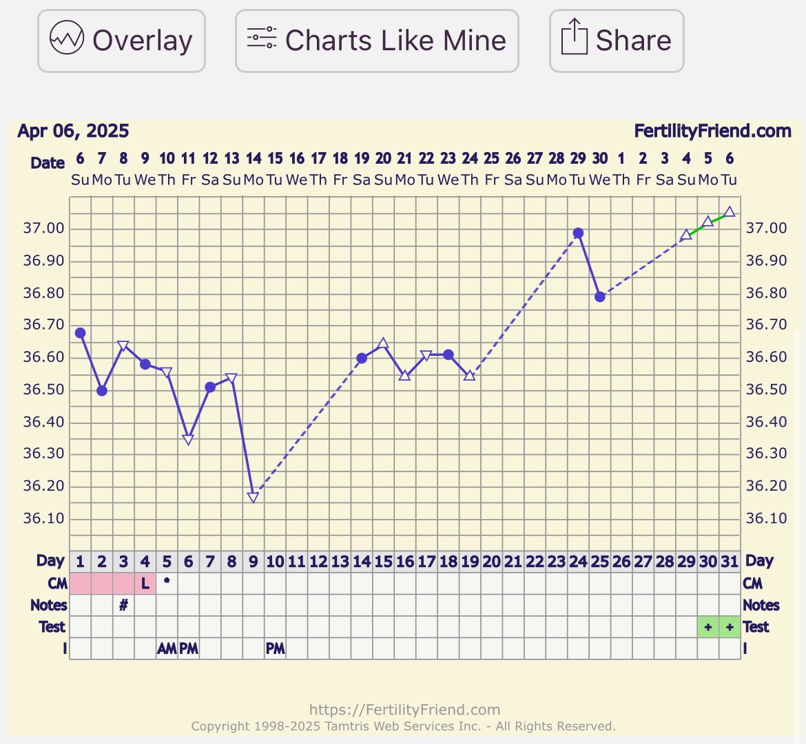 Ahojte po dlhsiej dobe sa hlásim. 🙂 v apríli moje meranie bolo skôr nemeranie. Prepadla ma frustrácia a lekár uznal že od ďalšieho cyklu ideme na clostilbegyt. Tak že som na koniec vypla hlavu bez sledovania ovulácie na 16dc nasadila progesteron nech mám tento cyklus za sebou. A pravdepodobne to bude víťazný mesiac 🙈testy pozitívne po vysadení progesteronu ms neprišla a teplota ostala hore už som merala len pre zaujímavosť 🙂 15.5 idem k dr. Kázal nasadiť opäť progesteron na späť.