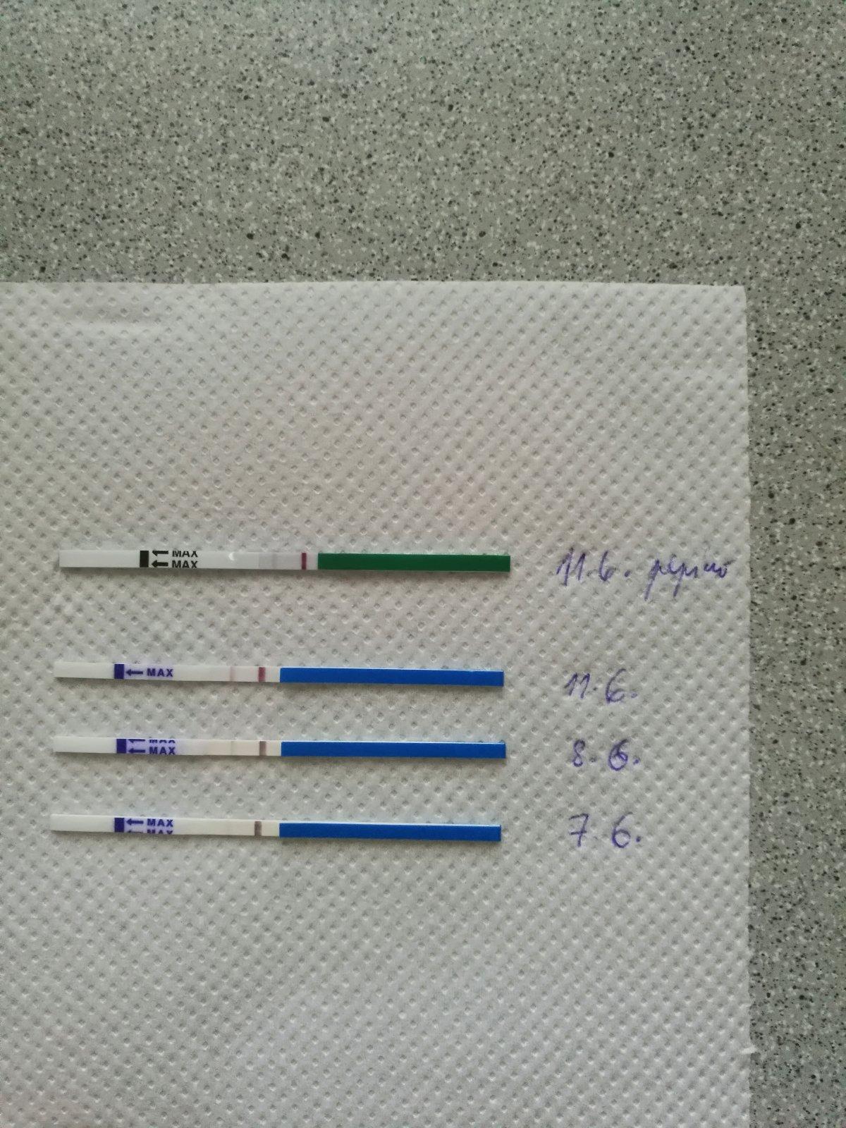 Dobré ránko. Baby, ja neviem, co si mam myslieť. Mne sa zdá, ze ta ciarka silnie. Pre istotu som dnes urobila aj desiatkovy pepino test, ci aj tam vybehne ciarka, vybehla slabá. FF vravi, ze vcera alebo dnes som mala dostat MS. Lenze spinim doteraz od 1.6. a jednorazove krvacania som mala 3., 4., 7. a 8.6. Podbrucho ma stale boli. Chystam sa zavolat doktorovi, ale bojim sa. Co toto zas bude.