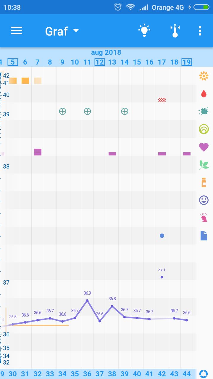 Ahojte prosim o radu co si myslite o mojom grafe? 15.8. Som bola u svojej gynekologičky a povedala mi že mám krásny veľký folikul ktorý podľa nej uz praskne v ten deň som mala podbruska bolesti citila som ze dnes bude ovulacia lebo aj teplotu v daní deň mám vždy nizku nasvedčuje aj teplota od 16. Az do dnes ratala som ze uz mi vyznaci ovulku lebo mám vysoke teploty a nic aj dnes 36,98 co su presne u mna teploty po ovulke je to zvlastne stretli ste sa niektora s tymto ďakujem za každú radu 🙂