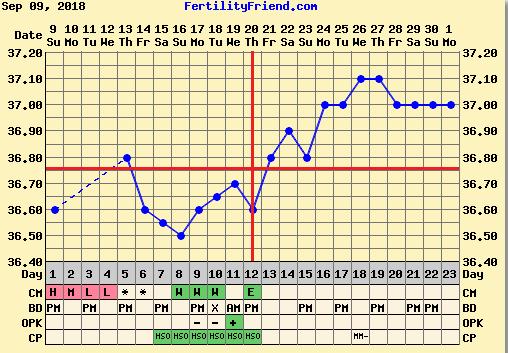 Dnes 16dc - prvý deň vyšších teplot ako v 6 predchádzajúcich dňoch. Hlien je zmeneny na creamy-watery. Folikuli su približne 20 a 16mm.