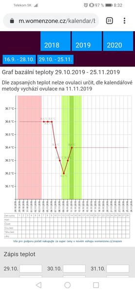 @mirus11 Ja sa v tom až tak nevyznám, ale podľa mňa ani jeden graf nevyzerá ako ovulačný. Niekto tu vysvetľoval pravidlo 6/3, že teplota po ovulácii musí byť aspoň 3 dní po sebe vyššia ako pred ovuláciou a teplota pred ovuláciou musí byť aspoň 6 dní po sebe nižšia ako po ovulácii. To tam nevidím splnené, aj appka ti píše, že podľa teploty ovuláciu nevie určiť. Môže to byť aj preto, že za niektoré dni ti chýbajú údaje. Meriaš každý deň v tom istom čase?