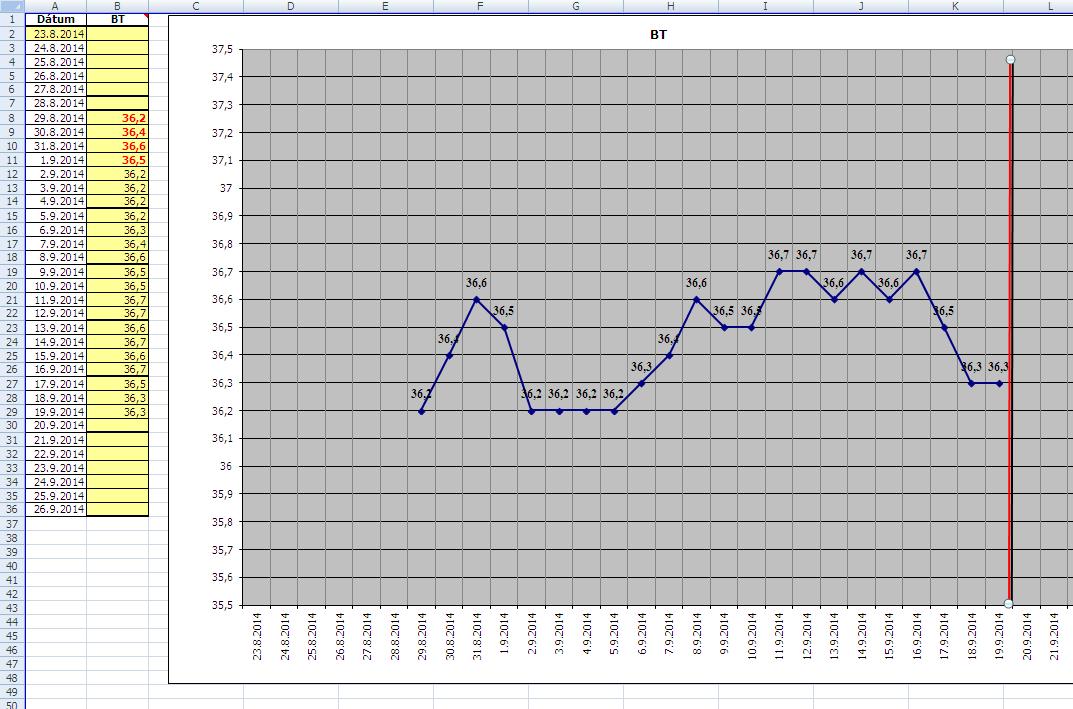 Problém je, že zo začiatku cyklu som ešte nemerala (ešte sa to len učím). Začala som až na siedmy deň. Aj to tie prvé dve merania boli merané o dve hodiny neskôr a tretie a štvrté meranie je merané cca o tri hodiny neskôr než všetky ostané. Teda na tie prvé štyri čísla sa nedá až tak spoľahnúť, tak som ich označila červeným. Ale zapísala som namerané teploty.