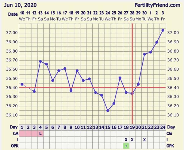 Dievčatá, môj tohto mesačný graf bol od začiatku čudný.. Teploty najprv vyskočili hore, potom som dostala na 3 dní teploty do 39, tak som nemerala a po teplotách bazalka klesla na veľmi nízke hodnoty, čo som nikdy nemala.. No a na 11dpo úplný pokles až k čiare, tak už som bola sklamaná, že to nie je možné, lutealka sa asi tou chorobou skrátila a dostanem skôr MS. Ale viete čo??? Na 12dpo teplota stúpla o 0,3 stupňa hore a na ďalší deň tiež bola hore. Dnes som 14 DPO a na teste dnes ráno kraaasna čiarka. Som dojatá a šťastná, stále tomu nemôžem uveriť. 🥰💗🍀. Verím a dúfam, že tentokrát to dotiahneme do šťastného konca... Ešte ani zďaleka nič nie je vyhraté, ale veľmi sa teším // čiarkam.. Je to krásny pocit, no zároveň sa aj bojím, aby to nedopadlo ako naposledy. 💞🙏