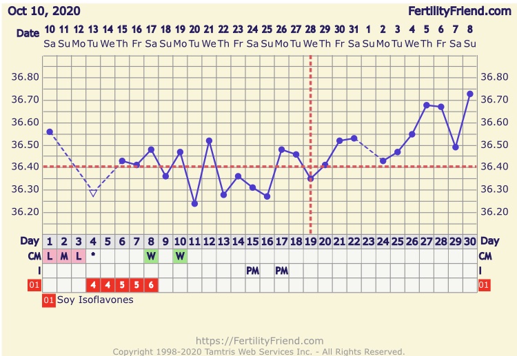 Potrebujem poradiť 🙂 tretí cyklus beriem fytosoju namiesto Clostilu. Ale tento mesiac bol graf zvláštny. Dokonca som nemala ovuláciu ani 16. Teho ako predtým vďaka fytosoji. Appka mi ju označila 19 teho ale to podľa mňa nie je dobré zaznačené lebo az tak pred troma dňami som mala kúsok viac toho plodneho hlienu a už ma aj začali bolieť prsia ako ma vždy po ovulacii začnú bolieť.