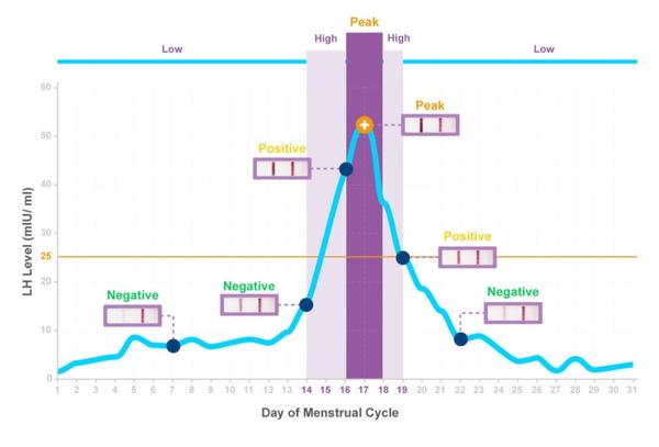 Mne inak celkom pomohol tento graf lepšie pochopiť priebeh LH hodnôt v rámci cyklu- v prvej fáze je priebeh tiez ako krivka (čo teda môže byť príčinou toho striedania svetlejsich a tmavších čiarok) potom je nárast a pokles, kedy už test ukazuje pozitívne - toto cele ale môže prebehnúť aj medzitým ako testujes (v noci napr, nemusí to trvať tri dni ako v grafe, je to individuálne), ak testujes napr len raz za den- vtedy ten peak nezachytis napriek tomu, že prebehol (preto sú tie testy aj celkom nespoľahlivé)..preto sú aj baby čo im neukázal vôbec LH test pozitívne a aj tak v daný mesiac otehotneli, takže môže sa stať aj že to človek premešká..plus ďalšia vec je, že pozitívny LH test ešte nie je zárukou, že ovulácia aj naozaj prebehne, môže sa stať že folikul nepraskne a podobne (ďalší dôvod, prečo sú tie testy nespoľahlivé) ..dôkazom je myslím až nárast hladiny progesterónu