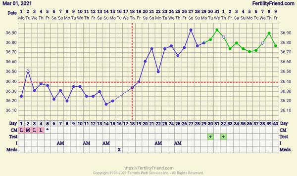 Dobré ráno. Prosím vás, ak máte viac skúseností, je tento graf dobrý, alebo mám čakať ms? Sa mi zdajú tie poovulačné teploty nízke. Pri predchádzajúcom tehotenstve som mala okolo 37.0, ale brala som vtedy duphaston. Teraz nemám nijaké problémy, ani k doktorovi sa tak skoro nechystám. Ten spodný test je neskorší, ani to sa mi nezdá, lebo je slabší a sú to rovnaké typy testu z jedného dvojbalenia. Prešiel týždeň a nič sa nedeje. Ďakujem.