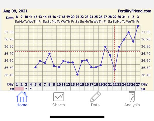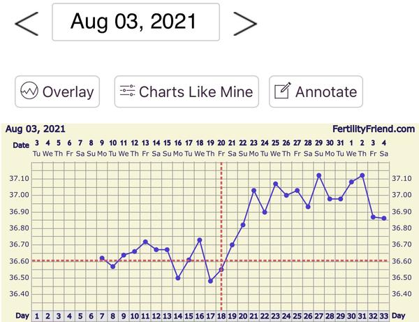 @zuzik5891 @luci601 ako ja mávam celkovo vyššie teploty ale s tým spojené aj reumatické bolesti.. ako keby mi nejak tie hormóny spôsobovali riadne bolesti... No teraz sa cítim úplne super hoci mi teploty išli hore ... Je pravda že takto super som sa cítila aj keď som bola tehu... Nemám grafov veľa lebo som menila appku a celkovo to nesledujem dlho ale ovu som mávala pravidelne a tie teploty spojené so strešnými bolesťami som mala veľa krát a v tedy to tehu nebolo... Za posledných 365 dni 3x tehu takže to viem zhodnotiť.. pri tehu nikdy neboli tie bolesti. Bohu žiaľ to nedopadlo nikdy dobré či už hneď na začiatku alebo kus neskôr. Teraz už viem prečo sa to dialo a pichám fraxik asi 2-3 mesiace tak by to už mohlo byť ok. Pridám vám na ukážku graf z minuleho cyklu, tam bol ale posun ovu kôli chorobe. Ja som to vlastne tak kustik vzdala a zamerala som sa na chudnutie a nie na snižilkovanie. Teda aj sexik bol cez ovu len tak aby sa nepovedalo. Že som mala ovu som zistila spätne keďže pred večerom poklesu som chlastala s kamoškou a teplota bola samozrejme hrozne vysoká.. neriešila som to a ďalšie dni už išli zrazu z dola hore.. a tak reku že skúsim umelo znížiť tu teplotu v grafe a hneď mi naskočilo že ovu bola aj kedy aaa tak reku aj som gi sexik zaznačila 🤣🤣🤣.. takže ak sa zadarilo tak bez pridaného vedomia, snaženia sa😁