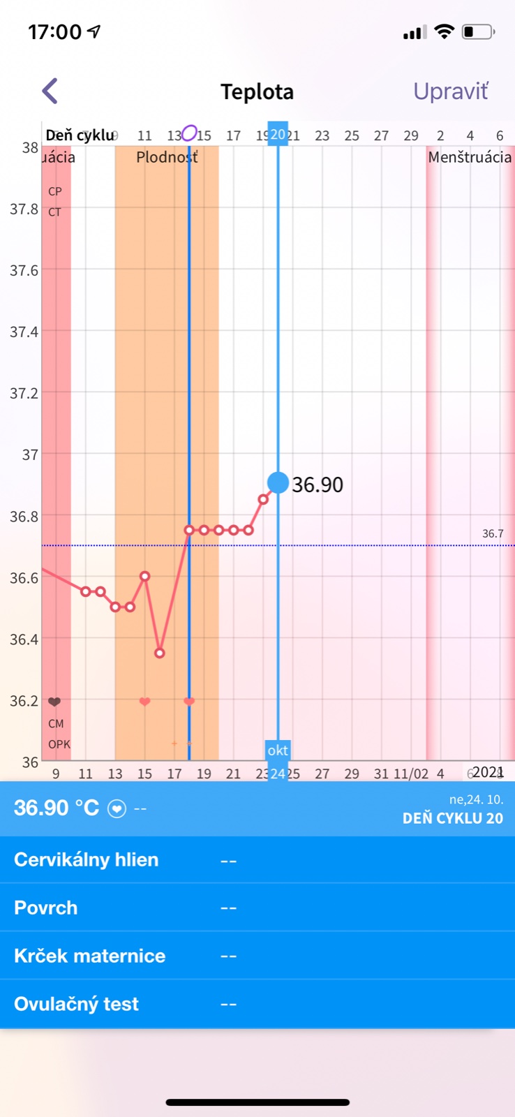 Pekný cyklus aj graf to bol. Konečne prvé obdobie, kde sme vedeli kedy mam ovu, kedy sa mame snažiť, pila som alchemiku, odopriala som si moju chutnú kávu. Už som si začínala myslieť, že to vyjde a zrazu dnes neskutočný pád. Aj keď som ešte nedostala, deň dva a je tu. Ďalší cyklus asi nemeriam, úplne vypnem. Dúfam, že sa mi to podarí.