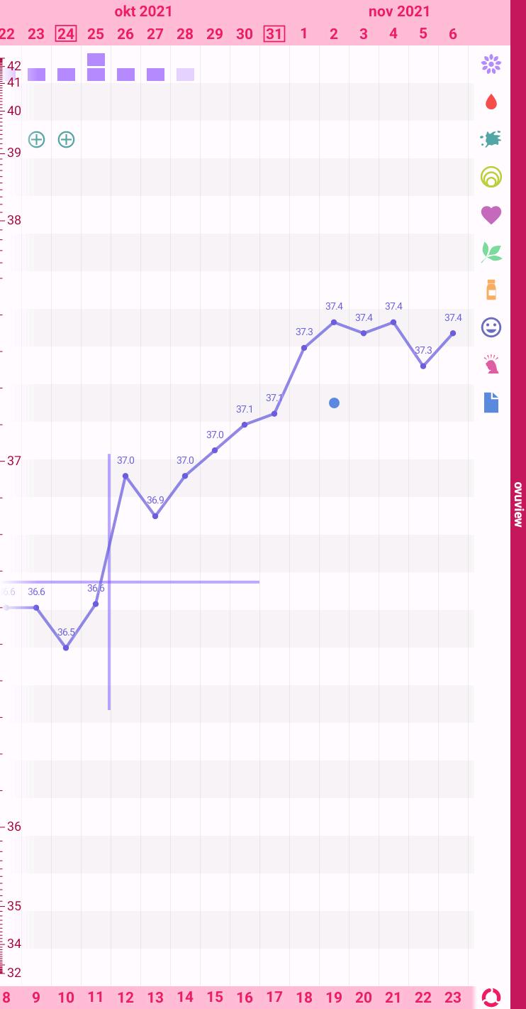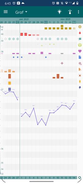 @antonka no ak si mala vo štvrtok pozitívny test, pokojne mohla ovu prebehnúť aj v sobotu (cca 48h po teste). Čo sa týka grafu, on označí ovuláciu až keď budú tri za sebou idúce teploty vyššie ako 6 predchádzajúcich, takže zatiaľ meraj a podľa mňa ak zajtra a pozajtra bude teplota stále vyššia, graf by ti to mal označiť. Treba ešte merať, zatiaľ to podľa mňa ešte nie je jasne