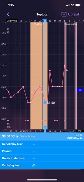 @patulka2 Podla teplot z grafu naozaj vyzera, ze ovu este nebola...nestresuj sa ale z toho...ved ono to este prist moze. 😊 Vsetky zeny nemozu byt ako svajciarske hodinky...ja mam tento mesiac taky zvlastny..vacsie piky...ale je pravda, ze zaciatok cyklu som bola bez gynexu a aj to meranie flakam..niekedy zmeram o 6, niekedy o 7..dnes som merala o 8..kedze je sviatok a mozeme si s manzelom prispat (lebo este nemame deti 😂)...sup, som to do grafu zaznacila a pomyslela si, ze prdiiiim to. Sak viem, ze som merala neskor a preto je teplota vyssia....dnes som 19 DC, takze podla predchadzajucich mesiacov sa tiez teraz blizim k obdobiu ovu..no som zvedava ci bude a zaroven si hovorim, ze nemozem to moc riesit...max jeden ovu test denne a co rano nameram a kedy nameram, to bude...