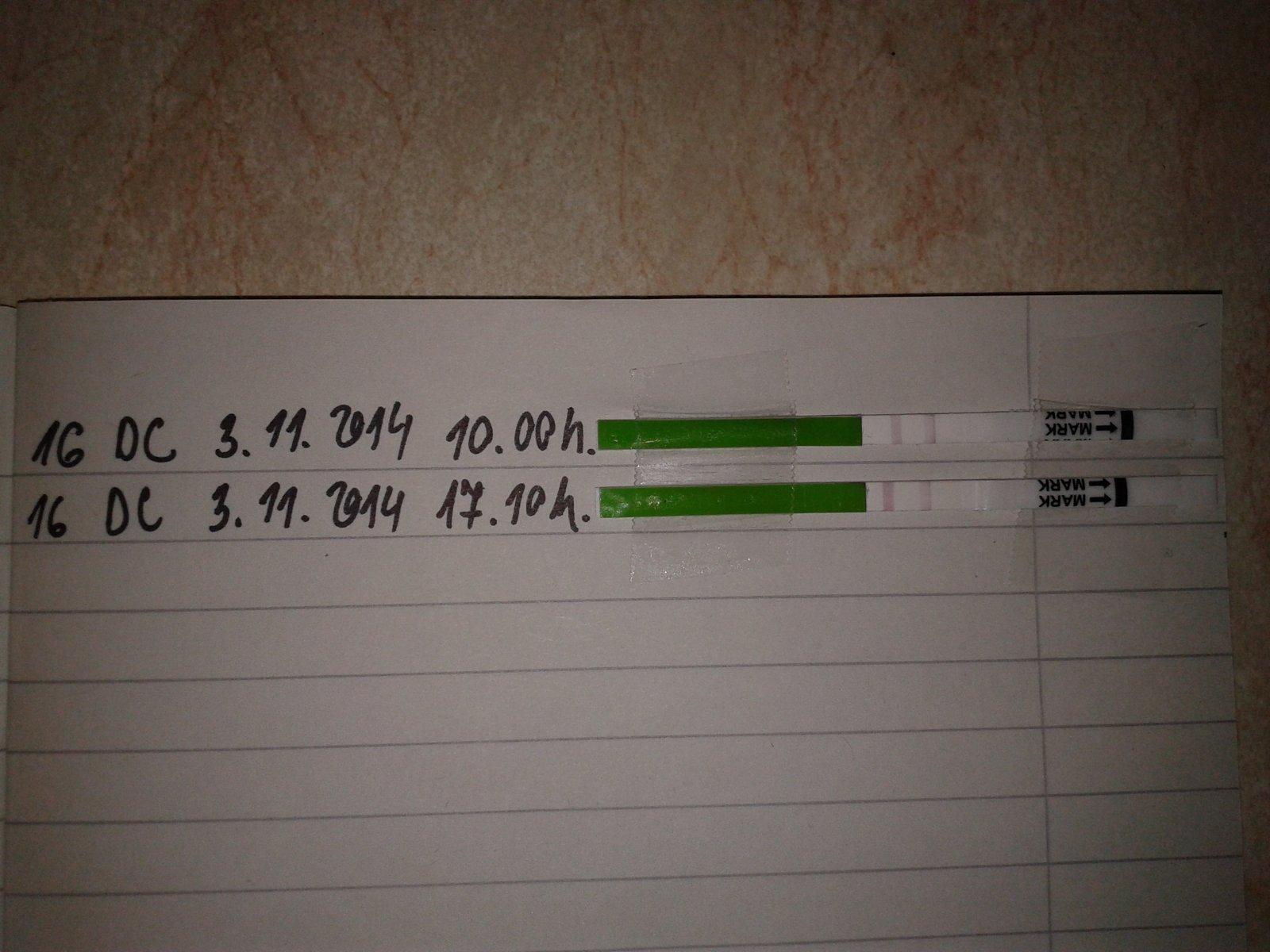 @petra212 ten na 15 DC je negatívny, ešte je pomerne bledý oproti kontrolnej čiarke, ani tými na 16 dc si nie som 100 % istá, tiež im trošku chýba, tak skús ešte zajtra, to by už mali byť top. Ak budú slabšie, považuj za pozitívne tie dnešné. Nerob ovu testy skôr ako o 10.00 hod., aj keď si nerobila z prvého moču, ale ráno je vraj hladina LH nejako rozkolísaná a ustaľuje sa až po desiatej hodine, najideálnejšie sa drží poobede okolo 16-17.00 hod. tak uvidíme, čo ukáže.
