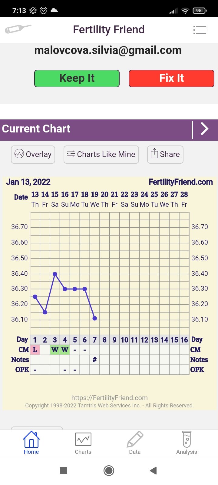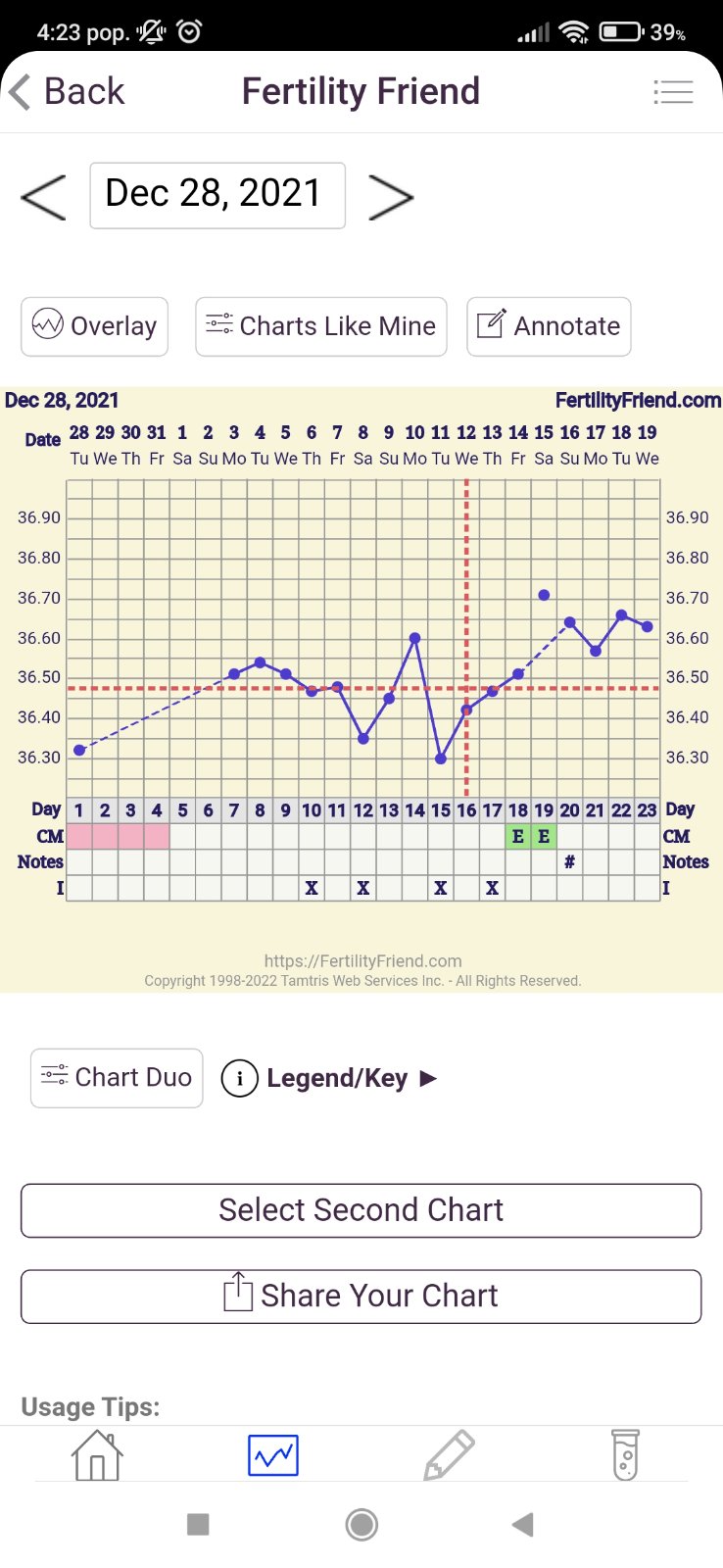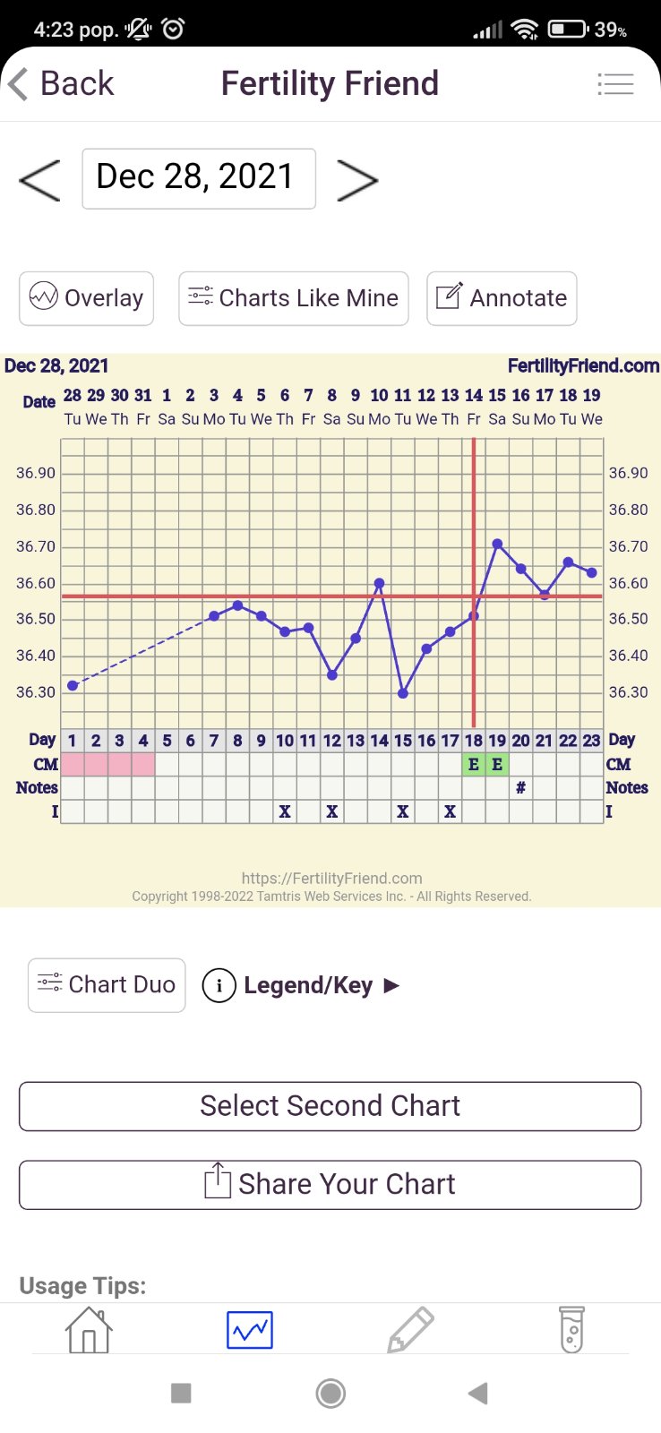 dnes 23DC a ja stale neviem ci tento mesiac bola ovu, akosi sa mi to nezda, uz asi tyzden mam taky natahovaci hlien... appka mi aj vyznacila ovu na 18DC, lenze od soboty (19dc) sme boli vsetci doma nachladnuti, tak asi to ovplyvnilo teplotu, ked tu teplotu z 19DC dam discarted, tak mi ovu prehodi na 16DC, lenze mne pride, ze tie teploty mam nizke, dnes len 36,63°C, minule mesiace som mala po ovu teploty 36,9-37°C. a stale aj ten vytok natahovaci ma matie 🤷🤷
