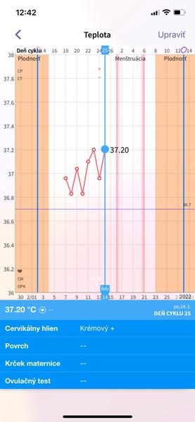 @domulibalazova čo sa sledujem 4 neúplné cykly. Boli zatiaľ dve ovulácie + táto. Pri tých dvoch BT nestupala takto, ledva na hornú hranicu alebo teste nad ňou a potom sa držala medzi hornou a dolnou hranicou. A LF bola 12 dní.