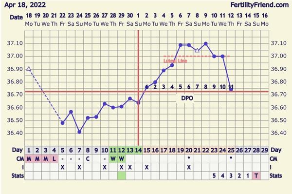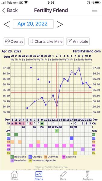 Ja mam tento mesiac podobný graf, vždy sa mi držali teploty vyššie a klesli tak dva dni pred menzesom. Lf mam 13 dni MS by mala dôjsť v sobotu a pokles mam už niekoľko dní. Dnes ráno som merala o hodinu a pol skôr lebo syn berie ATB tak som mu dávala a hneď merala a teplota 36,54 a v čase keď meram stále už bolo len 36,47🙈 . Zapísala som prvú ale graf je divny