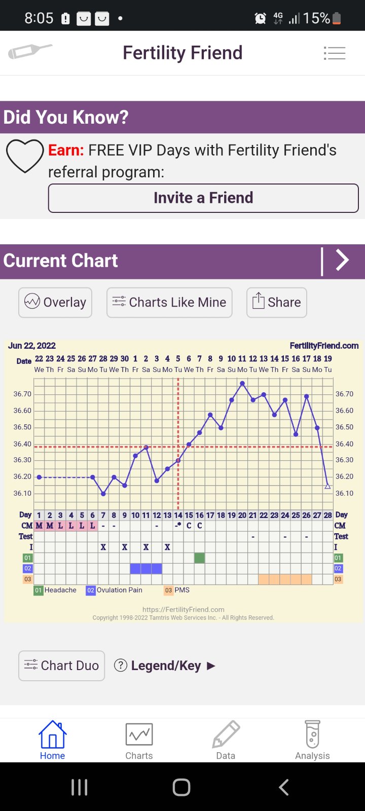 A tvoje ma mrzí, že už máš ms, držala si sa celkom pekne. A čo sa týka tej prerusovanej čiary, to je len predpokladana ovu podľa teplôt. Neznamená to, že si mala anovulacny. Podla tvojich teplôt si podľa mna ovu isto mala lebo si pekne vystúpila a držala sa hore.