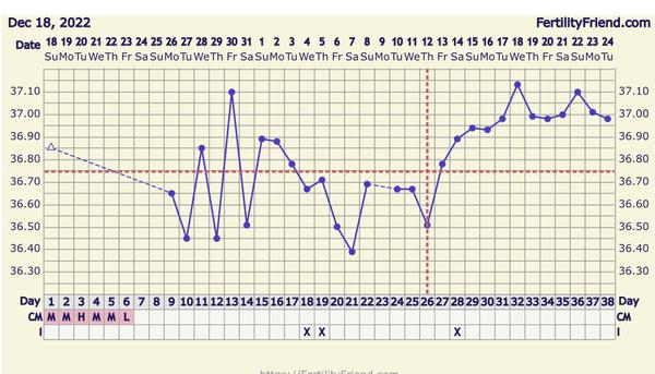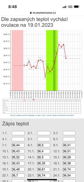 Ahojte, som tu nová a začala som tento mesiac s meraním BT. Snažím sa s manželom o bábätko iba 4 mesiace ale chcem tomu trošku "pomôcť" a pochopiť svoj cyklus. Beriem inofolic - len 1 denne a gynex kvapky - mám zníženú funkciu ŠŽ veľa veľa rokov, donedávna som TSH mala vždy viac ako 4 a zle nastavenú liečbu, posledne sa mi to snáď aj vďaka gynexu upravilo na 2,64 čo by malo byť v norme. Teplotu nemeriam celý cyklus a priznávam, nebolo to vždy v úplne rovnaký čas, no posledných cca 5 dní sa snažím aby to bolo približne v rovnakej hodine. Ovuláciu mi to hodilo na 18 deň, ale podľa OVU tesu by mala byť 16 deň. Čo hovoríte na graf? teploty sa mi zdajú dosť vysoké, okre toho ma bolia prsia už 4.deň, čo ma síce zvyknú aj pred MS ale zdá sa mi že nie až tak skoro, možno si to však len domýšľam...včera som bola dokonca extrémne unavená ale to môže byť aj týmto počasím... Myslíte, žeby to tam mohlo byť? Veľmi si to želáme, tak si možno len domýšľam príznaky, prosím posúďte to vy čo máte viac skúseností. Hoci viem že si BT merám krátko... 🙂 Ďakujem žienky a veľa veľa šťastíčka každej z Vás 🙂