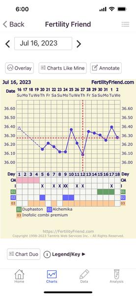 @patulka2 naozaj ovulacia podla grafu neprebehla. Ta aplikacia pomerne casto zle vyznaci ovulaciu. Co sa stane, ked duphaston vysadis? Nabuduce ho skus nasadit az po 3 vyssej nameranej teplote a ak budu dodrzane vsetky pravidla. Dokonca aj linia by mala byt na urobni tej teploty, ktora je z predoslych 6 - u teba je to v tomto podla mna zlom grafe 7-12 dc najvyssie. A teda na urovni 36,38 ci ako to mas. Mas naozaj pomerne nizke teploty vseobecne (pred ovulaciou su bezne)