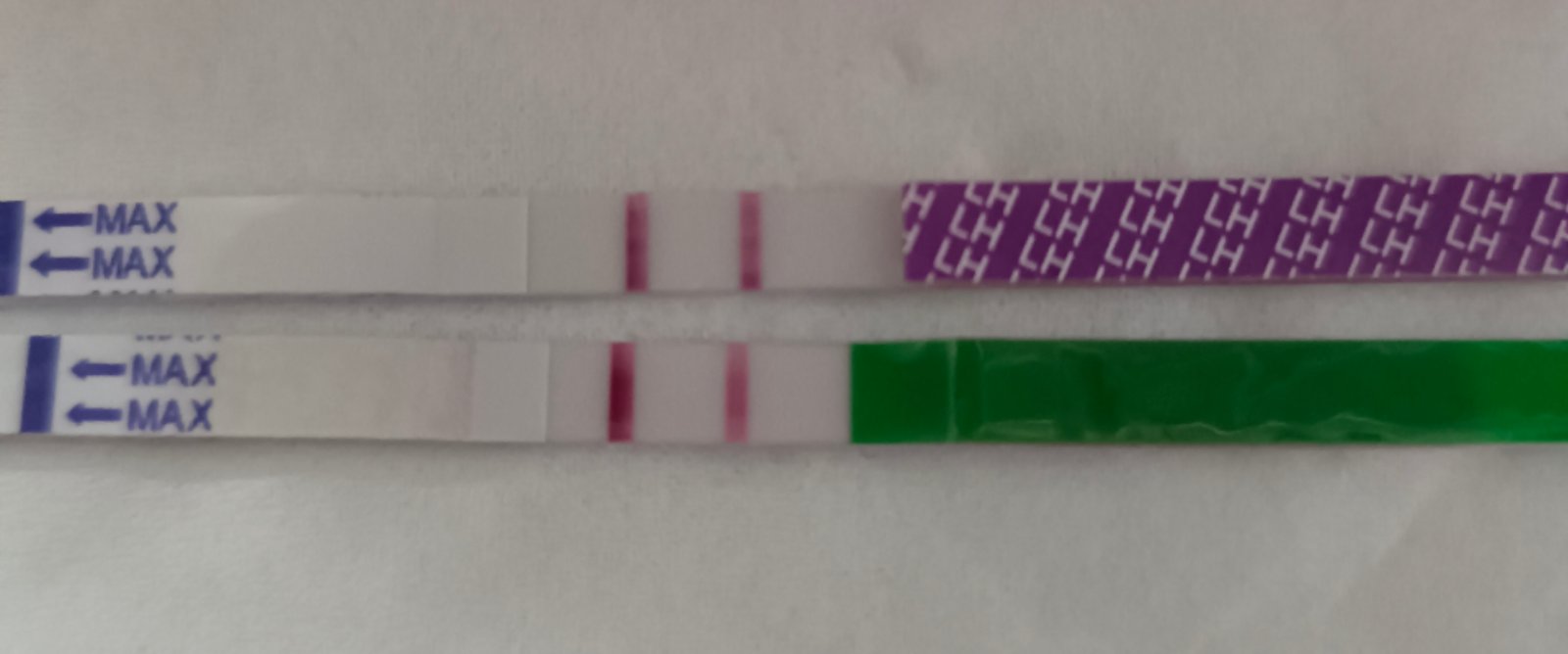 @bambulka711 a tu je ovu test livsane v tehotenstve už, cca 5tt 🤣 dokonca asi zvyšný test tej zlej šarze .. horný je uschnutý a spodný je asi po 5s v moči 😅