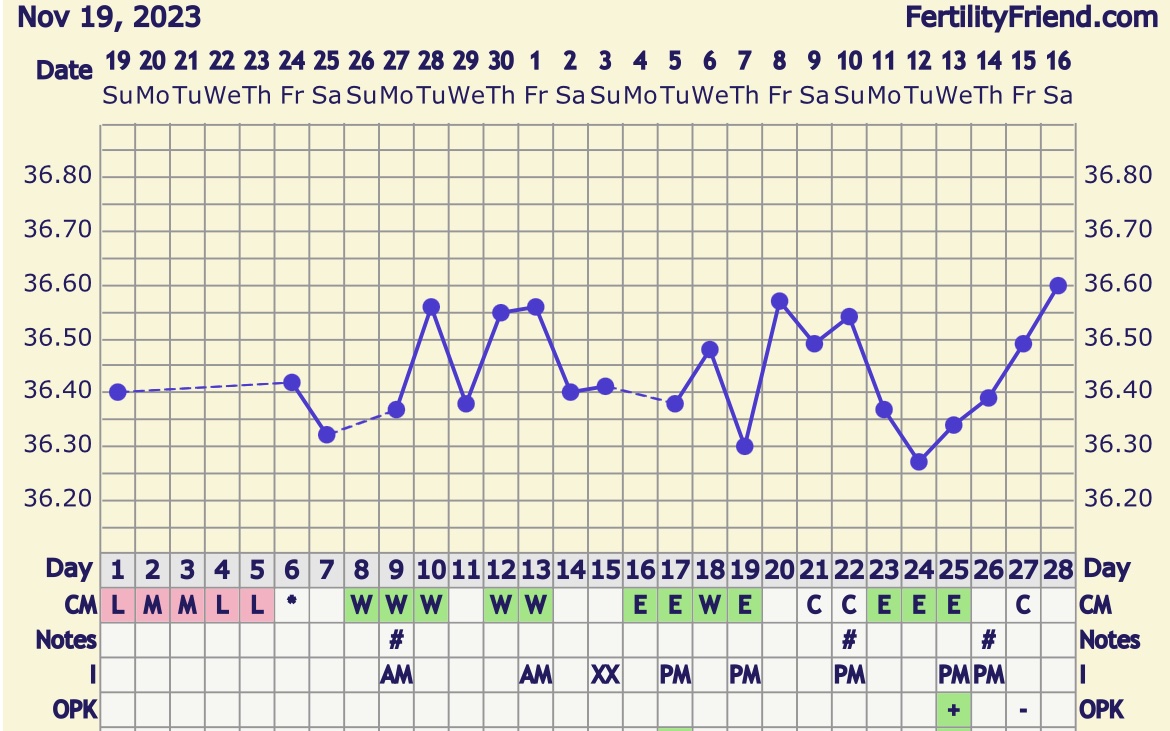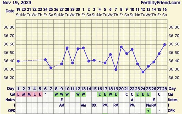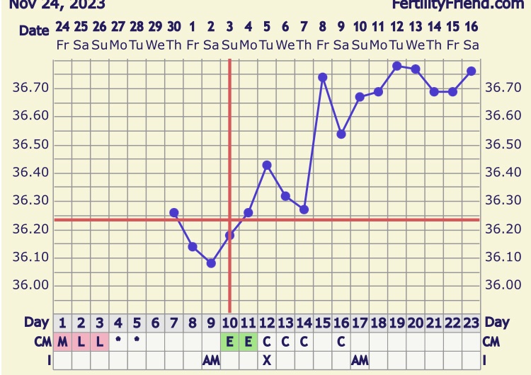 Baby aké máte krásne tie grafy 😍na to ako to na začiatku skoro u každej vyzeralo ako horská draha, tak všetkým sa vam krásne držia teploty. Držím palce každej jednej! ❤️🙏 moj graf zatiaľ takto, predvčerom pozitívny test, dnes pomalicky vzostup teploty, tak dufam že zajtra pojde zas vyššie a že včera ovu prebehla.