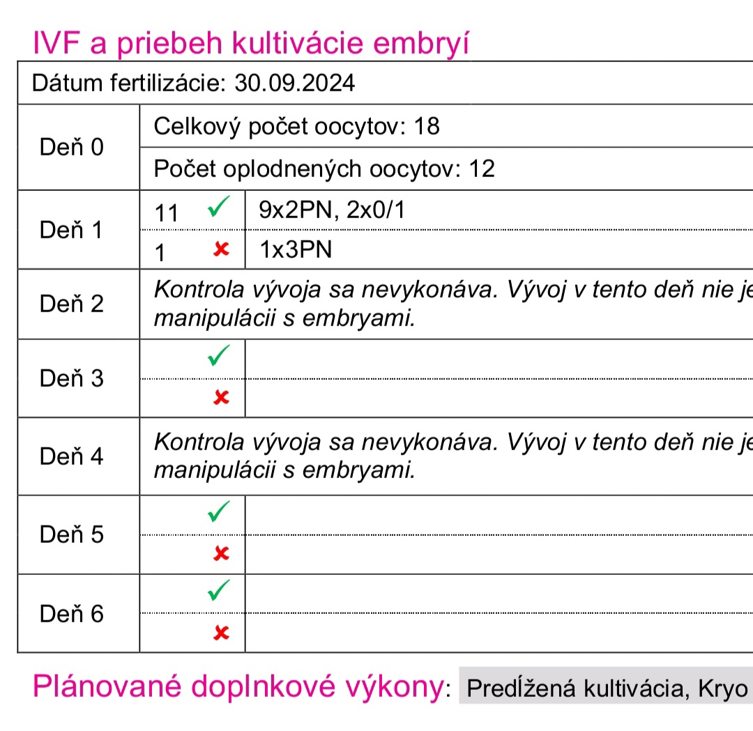 @andyka105 Odobratých vajíčok bolo 18, z toho zrelých 12... Do tých 12 napichali spermie. Z toho 9 sa oplodnilo tabuľkovo, 2 neoplodnili, ale ešte im dávajú šancu a 1 sa oplodnilo nesprávne.