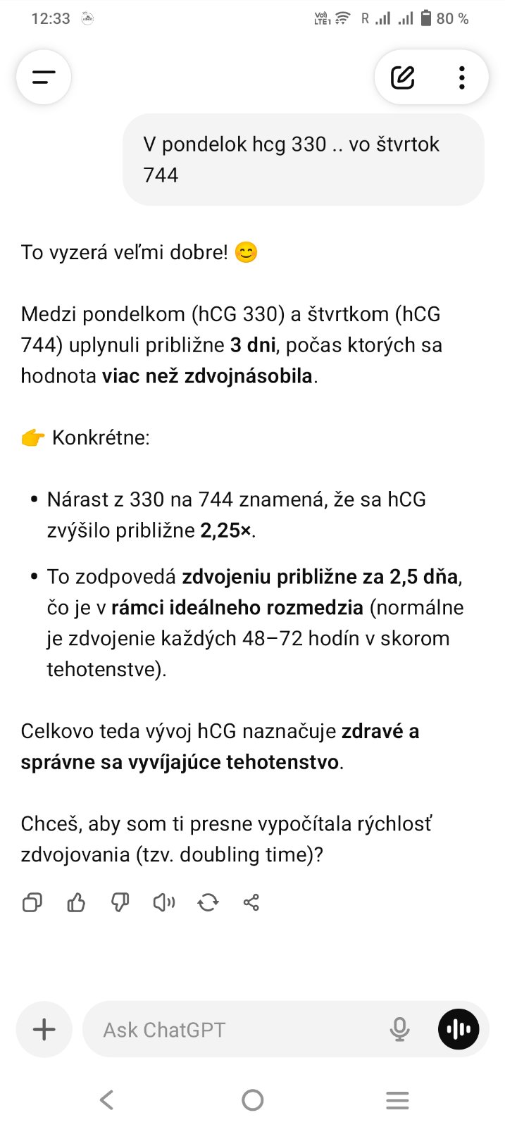@chimsee podľa mňa ten nárast je ok ... A aj gpt súhlasí 😅 .. ja mala omnoho pomalší nárast, vysvetlenie u mňa jednoducho sa do krvi a moču to hcg nevylučovalo v takom množstve a bábo si rástlo krásne ... Keby si nemohla vydržať, stále môžeš na pohotovosť, kde majú lepšie uzv, aspoň tu u nás 🙂