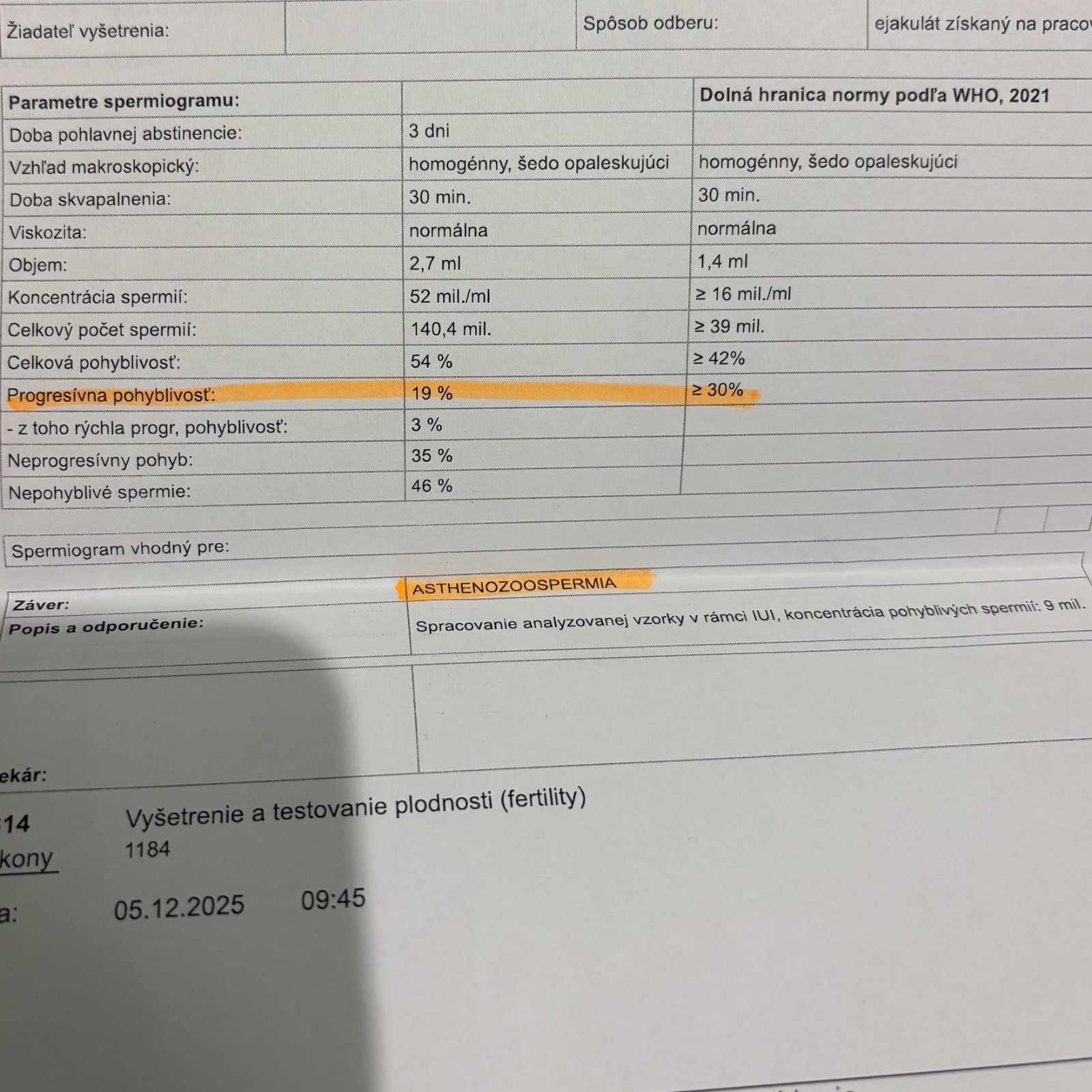 @zdsa ja som bola na kontrolu v Car tento mesiac sme sa rozhodli nechat iui tak ze po novom roku, no pridala sa komplikacia v marci ukazkovy spermiogram, v novembri cista katastrofa s diagnozou ze progresivna pohyblivost nizka ☹ 19% a ma byt minimalne 30% nema tu niekto skusenost ci postacilo iui? Ale mali sme planovany styk teraz a v piatok 18mm folikul s ovitrelle