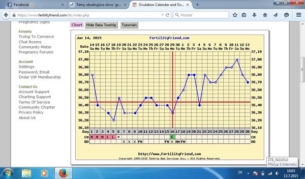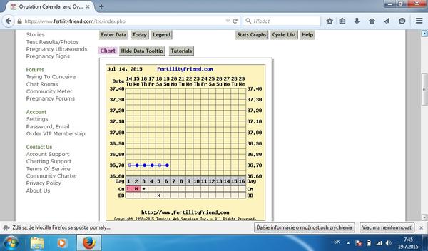 @zabudnuta no zatial graf ukazuje, ze 14.7. Ved to ti predsa sam vyznacil prekrizenymi cervenymi ciarami. Su prerusovane, lebo graf si nie je isty, ci ovulka prebehla, pretoze mas maly vystup teploty. Akonahle si graf bude teplotami uplne isty, ciary budu plne a nie prerusovane